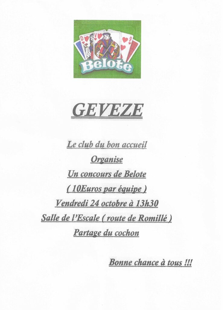 Annonce concours de belote à Gévezé… Publication publiée :21 septembre 2025 Post category:Actus / Gévezé Commentaires de la publication :0 commentaire Vous êtes passionné(es)s de belote alors le concours de belote du~ VENDREDI 24 OCTOBRE 2025 ~à 13h30à la Salle de l’Escale (route de Romillé)est pour vous…Aussi nous serons heureux de vous compter nombreu(ses)x parmi nous…A très bientôt autour de la table de jeux Vous devriez également aimer Café numérique à Gévezé 10 novembre 2023 Rappel « Marche Gourmande » La Mézière 26 avril 2025 Séjour à Carry-le-Rouet à St Grégoire 26 mars 2025 Laisser un commentaire Annuler la réponseCommentEnter your name or username to comment Enter your email address to comment Saisir l’URL de votre site (facultatif)